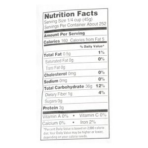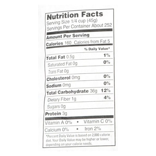 Lundberg family farms california white jasmine rice is an aromatic long grain rice your family will love. Fragrant, colorful and delicious, this rice is a perfect addition to meals when potatoes just won’t do. Versatile organic goodness and light soft texture will make this rice an instant hit with children. Each bag of lundberg family farms california white jasmine rice contains 25 lbs. Of product, translating into about 252 servings and 160 calories per serving. See nutrition facts panel for allergens.