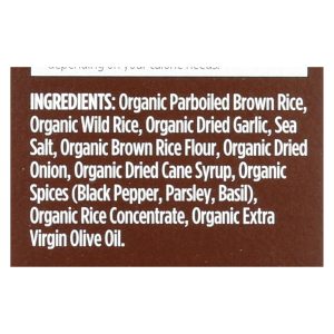ingredients : organic parboiled brown rice;organic wild rice;organic dried garlic;sea salt;organic brown rice flour;organic dried onion;organic dried cane syrup;organic spices;black pepper;parsley;basil;organic rice concentrate;organic extra virgin olive oil