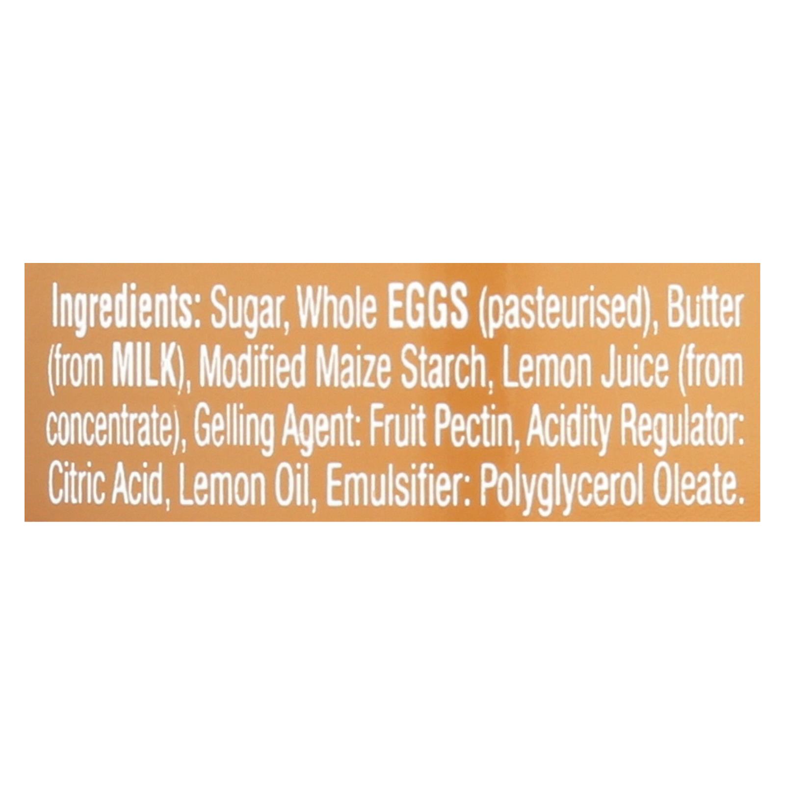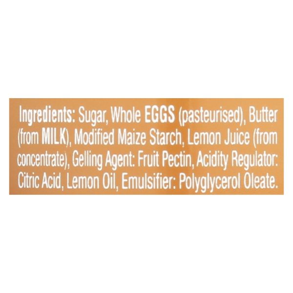 ingredients : sugar;whole eggs;pasteurised;butter;from milk;modified maize starch;lemon juice;from concentrate;gelling agent: fruit pectin;acidity regulator: citric acid;lemon oil;emulsifier: polyglycerol oleate