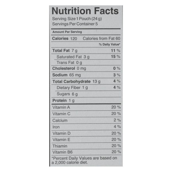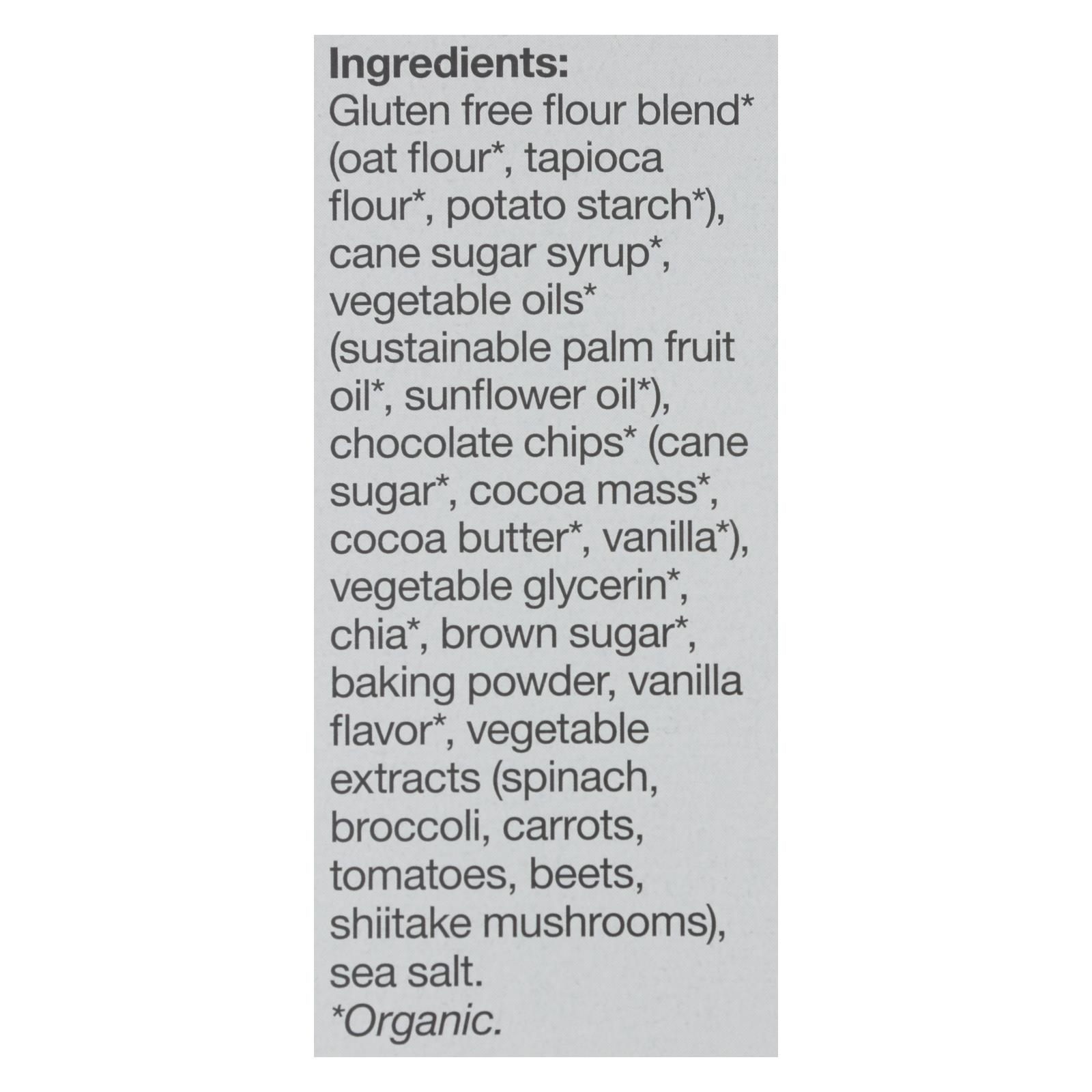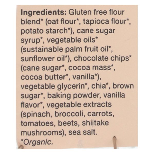 ingredients : gluten free flour blend;oat flour;tapioca flour;potato starch;cane sugar syrup;vegetable oils;sustainable palm fruit oil;sunflower oil;chocolate chips;cane sugar;cocoa mass;cocoa butter;vanilla;vegetable glycerin;chia;brown sugar;baking powder;vanilla flavor;vegetable extracts;spinach;broccoli;carrots;tomatoes;beets;shiitake mushrooms;sea salt