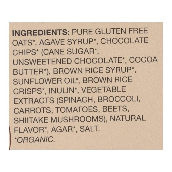 ingredients : pure gluten free oats;agave nectar;chocolate chips;cane sugar;cocoa mass;cocoa butter;vanilla;brown rice syrup;crisp brown rice;sunflower oil;inulin;molasses;vegetable extracts;spinach;broccoli;carrots;tomatoes;beets;shiitake mushrooms;vanilla flavor;agar