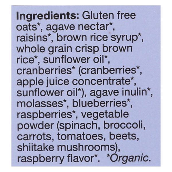 ingredients : pure gluten free oats;agave syrup;brown rice syrup;sunflower oil;raisins;brown rice crisps;inulin;dried cranberries;apple juice concentrate;cranberries;currants;freeze dried raspberries;vegetable extracts;spinach;broccoli;carrots;tomatoes;beets;shiitake mushrooms;natural flavor;agar;salt