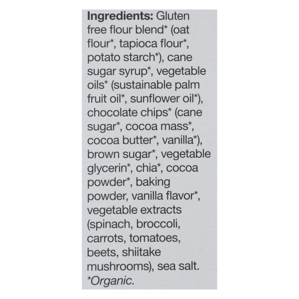 ingredients : gluten free flour blend;oat flour;tapioca flour;potato starch;cane sugar syrup;vegetable oils;sustainable palm fruit oil;sunflower oil;chocolate chips;cane sugar;cocoa mass;cocoa butter;vanilla;brown sugar;vegetable glycerin;chia;cocoa powder;baking powder;vanilla flavor;vegetable extracts;spinach;broccoli;carrots;tomatoes;beets;shiitake mushrooms;sea salt