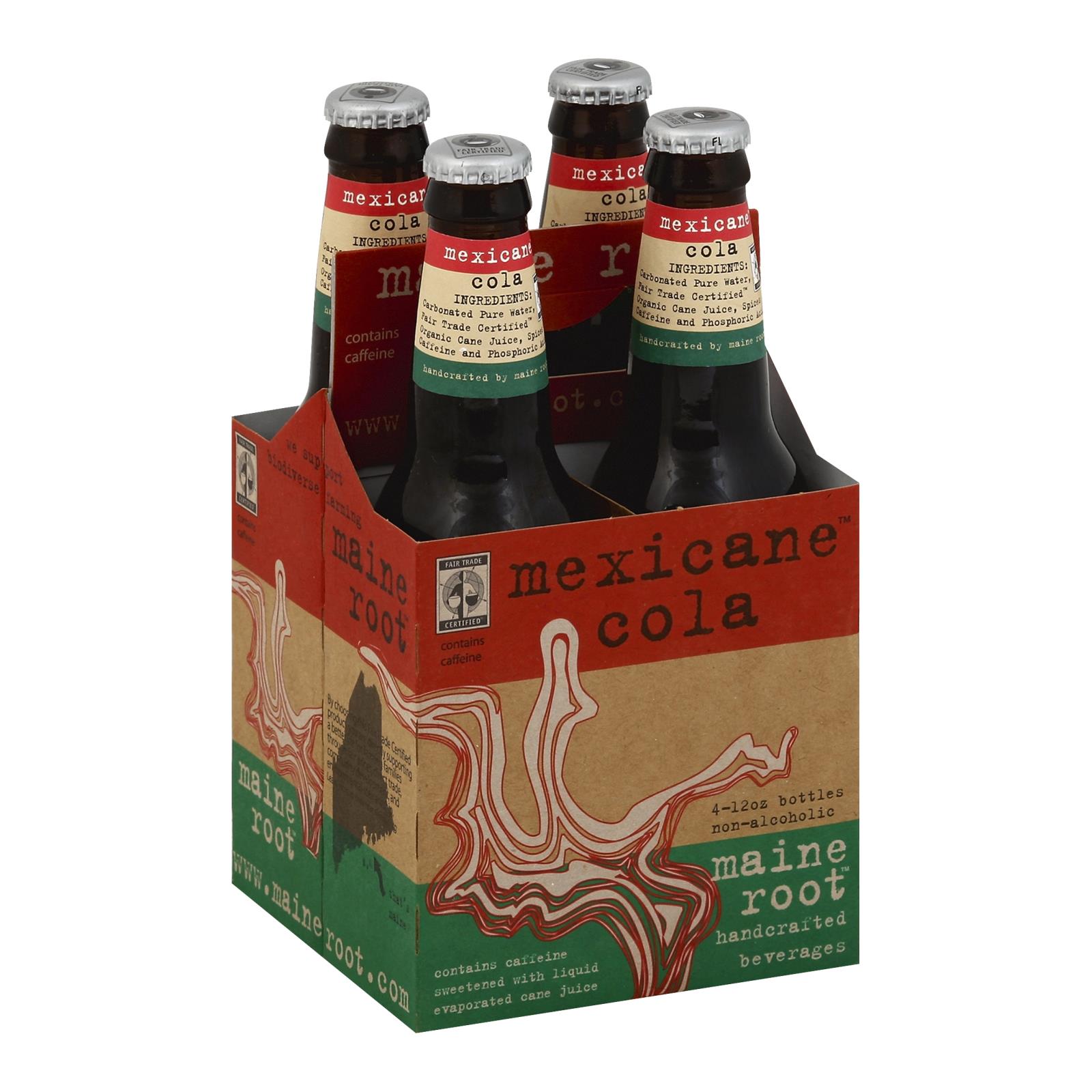 Maine root mexicane cola contains carbonated pure water along with fair trade certified organic cane sugar and spices. This non-alcoholic caffeinated beverage contains 165 calories per bottle and zero fat. The cola contains no milk, eggs, wheat, peanuts or soy. Each package contains four 12 oz. Bottles.