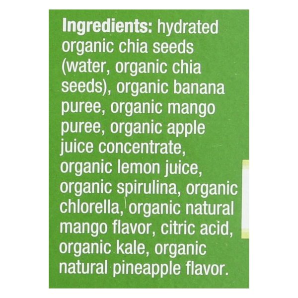 ingredients : hydrated organic chia seeds (water, organic chia seeds);organic banana puree;organic mango;puree;organic apple juice concentrate;organic lemon juice;organic spirulina;organic natural flavors;organic chlorella;citric acid;organic kale