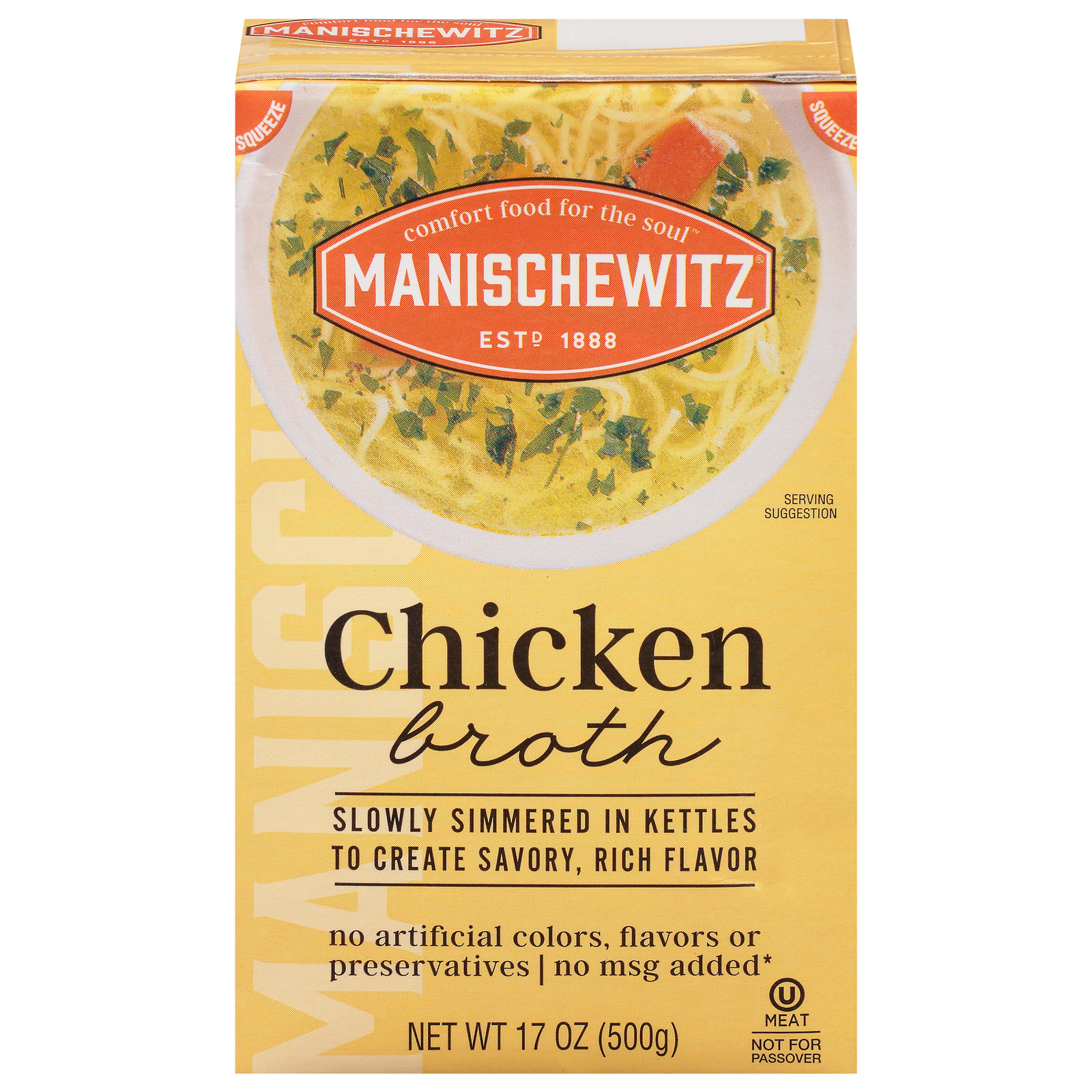Comfort food for soul. Estd 1888. No msg added (small amount of glutamate occurs naturally in yeast extract). Perfectly prepared, bubby style. There’s just something about a simple bowl of chicken broth that satisfies and nourishes like nothing else. Our traditional & simple comfort foods were born in the kitchen of jewish grandmothers (known as bubby in yiddish). At manischewitz, we continue in this wholesome tradition with our line of broths that are kettle cooked, simmered slowly to perfection and made from real, simple ingredients – just like bubby used to make. Here, have some more. Our broth is kettle cooked. Please recycle. Fsc: mix – board.