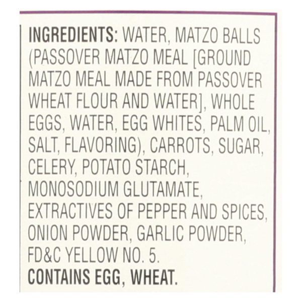 ingredients : water;matzo balls;passover matzo meal [ground matzo meal made from passover wheat flour and water];whole eggs;egg whites;palm oil;salt;flavoring;carrots;sugar;celery;potato starch;monosodium glutamate;extractives of pepper and spices;onion powder;garlic powder;fd&c yellow no. 5