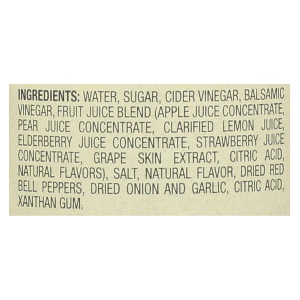 ingredients : water;sugar;cider vinegar;balsamic vinegar;fruit juice blend;apple juice concentrate;pear juice concentrate;strawberry juice concentrate;grape skin extract;citric acid;natural flavors;salt;natural flavor;dried red bell peppers;dried onion and garlic;xanthan gum
