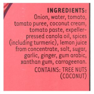ingredients : onion;water;tomato;tomato puree;coconut cream;tomato paste;expeller-pressed canola oil;spices;including turmeric;lemon juice from concentrate;salt;sugar;garlic;ginger;gum arabic;xanthan gum;carrageenan