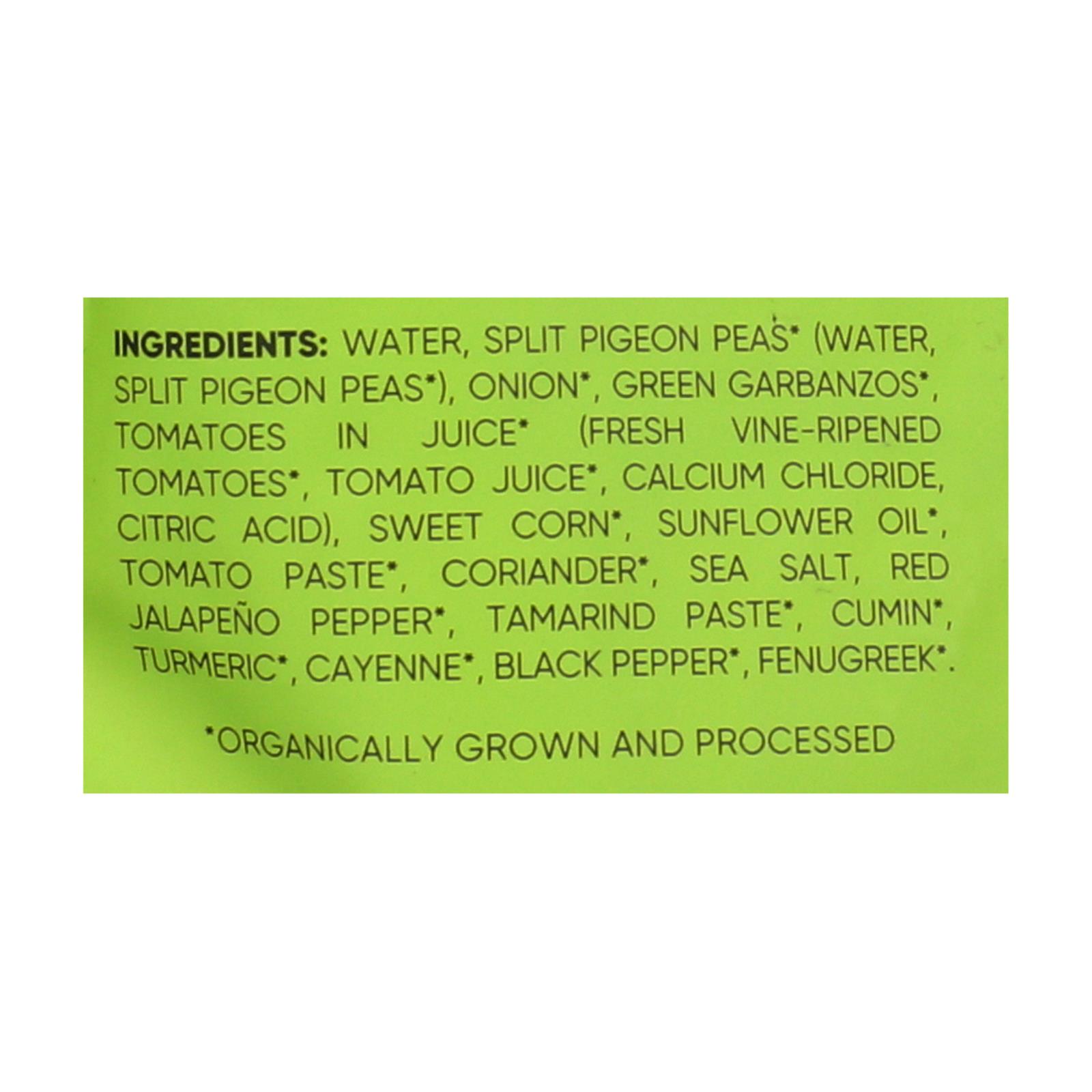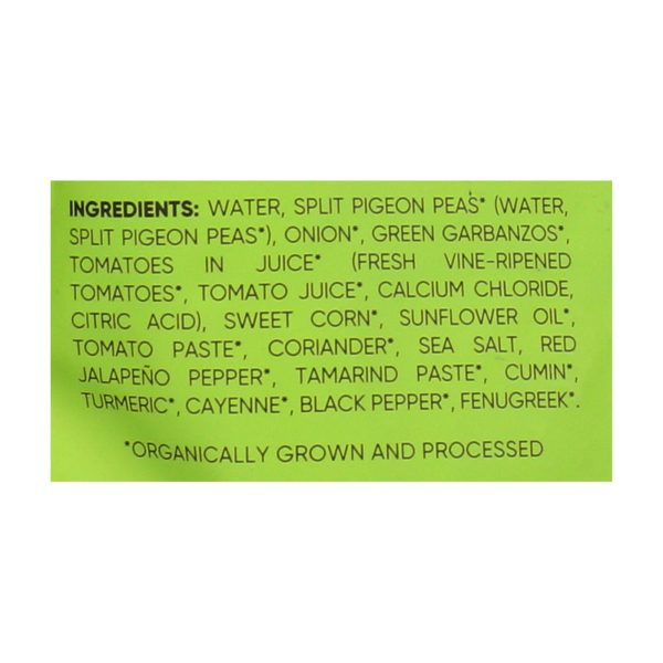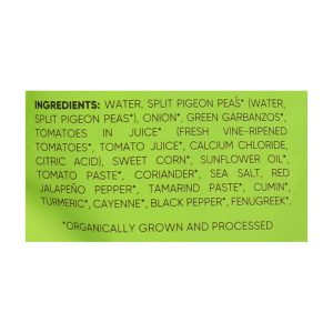 ingredients : water;split pigeon peas;onion;green garbanzos;tomatoes in juice;fresh vine-ripened tomatoes;tomato juice;calcium chloride;citric acid;sweet corn;sunflower oil;tomato paste;coriander;sea salt;red jalapeño pepper;tamarind paste;cumin;turmeric;cayenne;blacks pepper;fenugreek