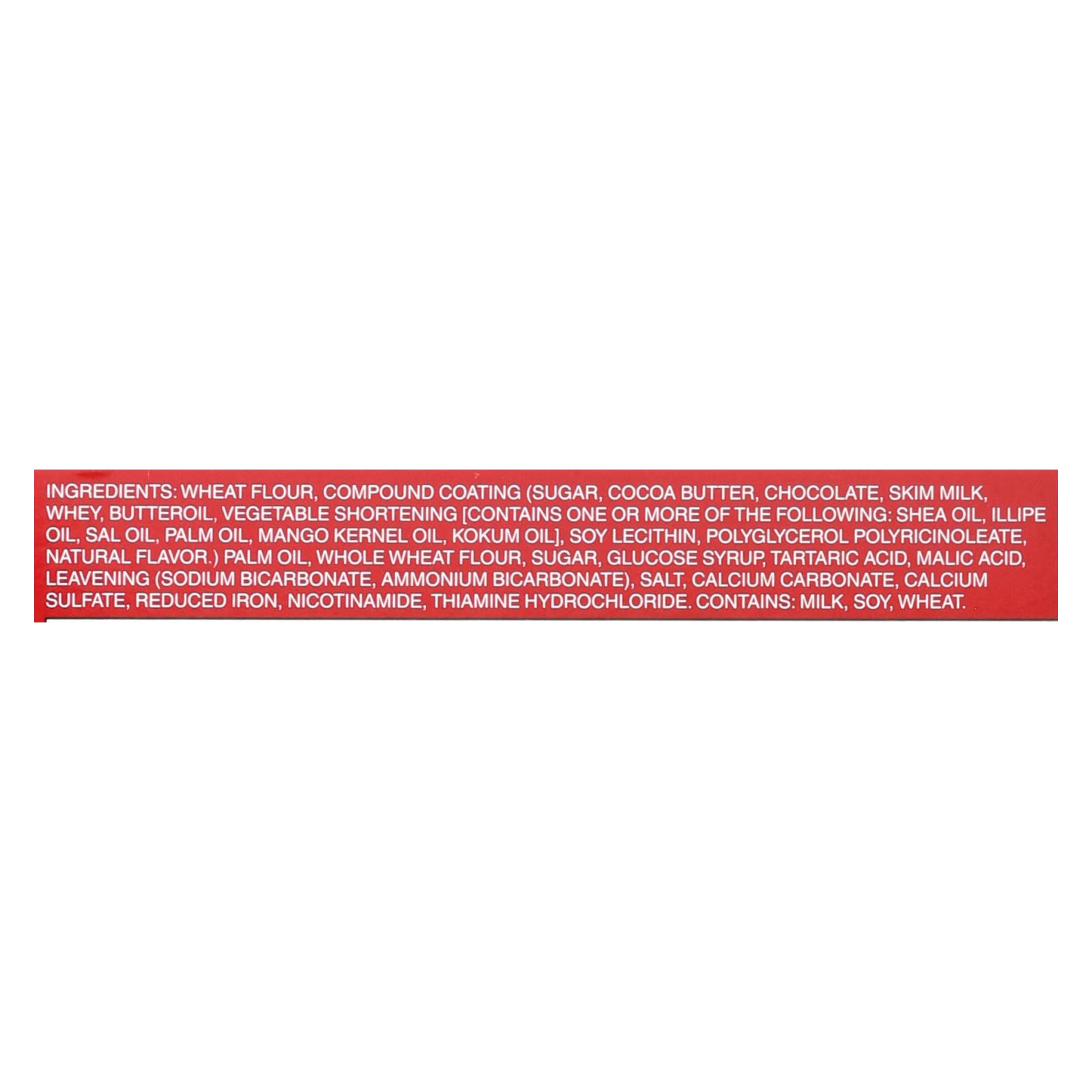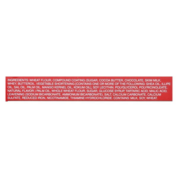 ingredients : wheat flour;compound coating;sugar;cocoa butter;chocolate;skim milk;whey;butteroil;vegetable shortening [contains one or more of the following: shea oil;illipe oil;sal oil;palm oil;mango kernel oil;kokum oil];soy lecithin;polyglycerol polyricinoleate;natural flavor;whole wheat flour;glucose syrup;tartaric acid;malic acid;leavening;sodium bicarbonate;ammonium bicarbonate;salt;calcium carbonate;calcium sulfate;reduced iron;nicotinamide;thiamine hydrochloride