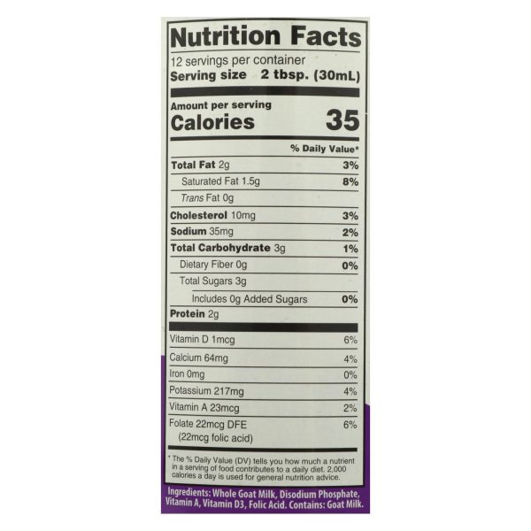 Vitamin a & d. Facebook. 3rd generation family owned since 1934! please recycle – meyenberg cares! available nationwide and online: www.meyenberg.com. Available nationwide and online: www.meyenberg.com. Made from the finest pasteurized whole goat milk. Undiluted, can be whipped. For rich flavor, substitute equal amounts in recipes calling for light cream, half & half or heavy cream. Diluted, substitute for whole cow milk in all recipes. Known since 1934 as the real milk alternative for many with cow or soy milk sensitivity. Supplemented with vitamin a, vitamin d3 and folic acid. Double strength. Homogenized. Unsweetened. Sterilized. Easy to digest. High in calcium. Low in sodium. Naturally gluten free. Nutritious and delicious. No preservatives. For more information: 1-800-343-1185. Made in the usa.