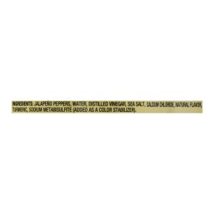 ingredients : jalapeno peppers, water, distilled vinegar, sea salt, calcium chloride, natural flavor, turmeric, sodium metabisulfite (added as a color stabilizer).