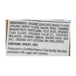 ingredients : organic enriched wheat flour (organic wheat flour, niacin, iron, thiamine mononitrate, riboflavin, folic acid);organic cane sugar;organic palm oil;organic molasses;organic ginger;baking soda;sea salt;organic soy lecithin (an emulsifier)