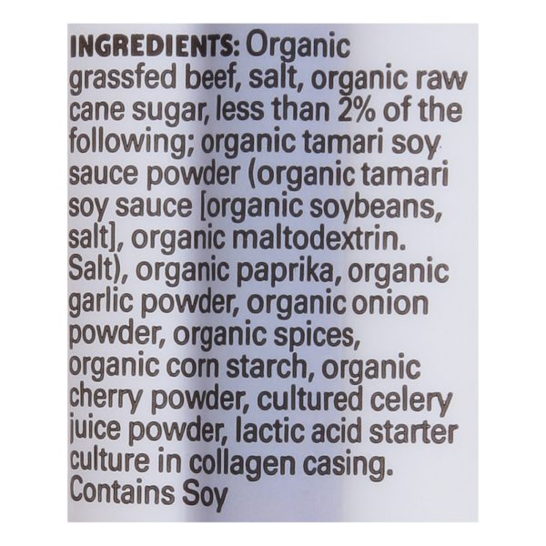 ingredients : organic grassfed beef;salt;organic raw cane sugar;less than 2% of the following;organic tamari soy sauce powder (organic tamari soy sauce [organic soybeans, salt], organic maltodextrin. Salt);organic paprika;organic garlic powder;organic onion powder;organic spices;organic corn starch;organic cherry powder;cultured celery juice powder;lactic acid starter culture in collagen casing