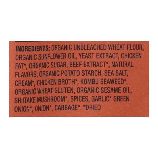 ingredients : organic ramen noodles (organic unbleached wheat flour, sea salt, organic vital wheat gluten);oil packet (vegetable oil [sunflower oil and/or soybean oil], sesame oil);seasoning packet (organic potato starch, yeast extract, natural flavors, sea salt, organic sugar, kombu extract*, cream powder (milk), sesame*, onion*, garlic*, organic caramel color*, rice fiber*, chili pepper*, fish sauce (fermented anchovies, salt)*, shiitake mushroom*, spices, green onion*, tomato*, organic gum arabic, cabbage*