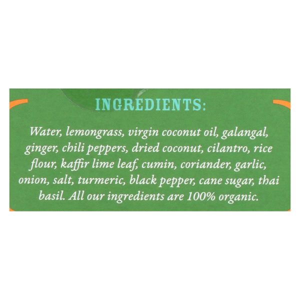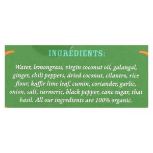 ingredients : water;lemongrass;virgin coconut oil;galangal;ginger;chili peppers;dried coconut;cilantro;rice flour;kaffir lime leaf;cumin;coriander;garlic;onion;salt;turmeric;black pepper;cane sugar;thai basil