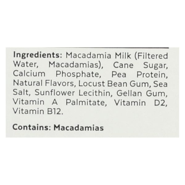 ingredients : macadamia milk;filtered water;macadamias;cane sugar;calcium phosphate;pea protein;natural flavors;locust bean gum;sea salt;sunflower lecithin;gellan gum;vitamin a palmitate;vitamin d2;vitamin b12