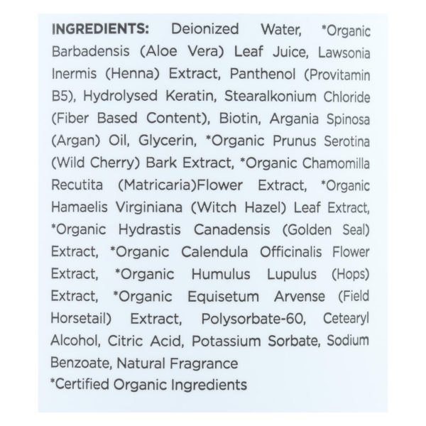 ingredients : deionized water;organic barbadensis;aloe vera;leaf juice;lawsonia inermis;henna;extract;panthenol;provitamin b5;hydrolysed keratin;stearalkonium chloride;fiber based content;biotin;argania spinosa;argan;oil;glycerin;organic prunus serotina;wild cherry;bark extract;organic chamomilla recutita;matricaria;flower extract;organic hamaelis virginiana;witch hazel;leaf extract;organic hydrastis canadensis;golden seal;organic calendula officinalis flower extract;organic humulus lupulus;hops;organic equis