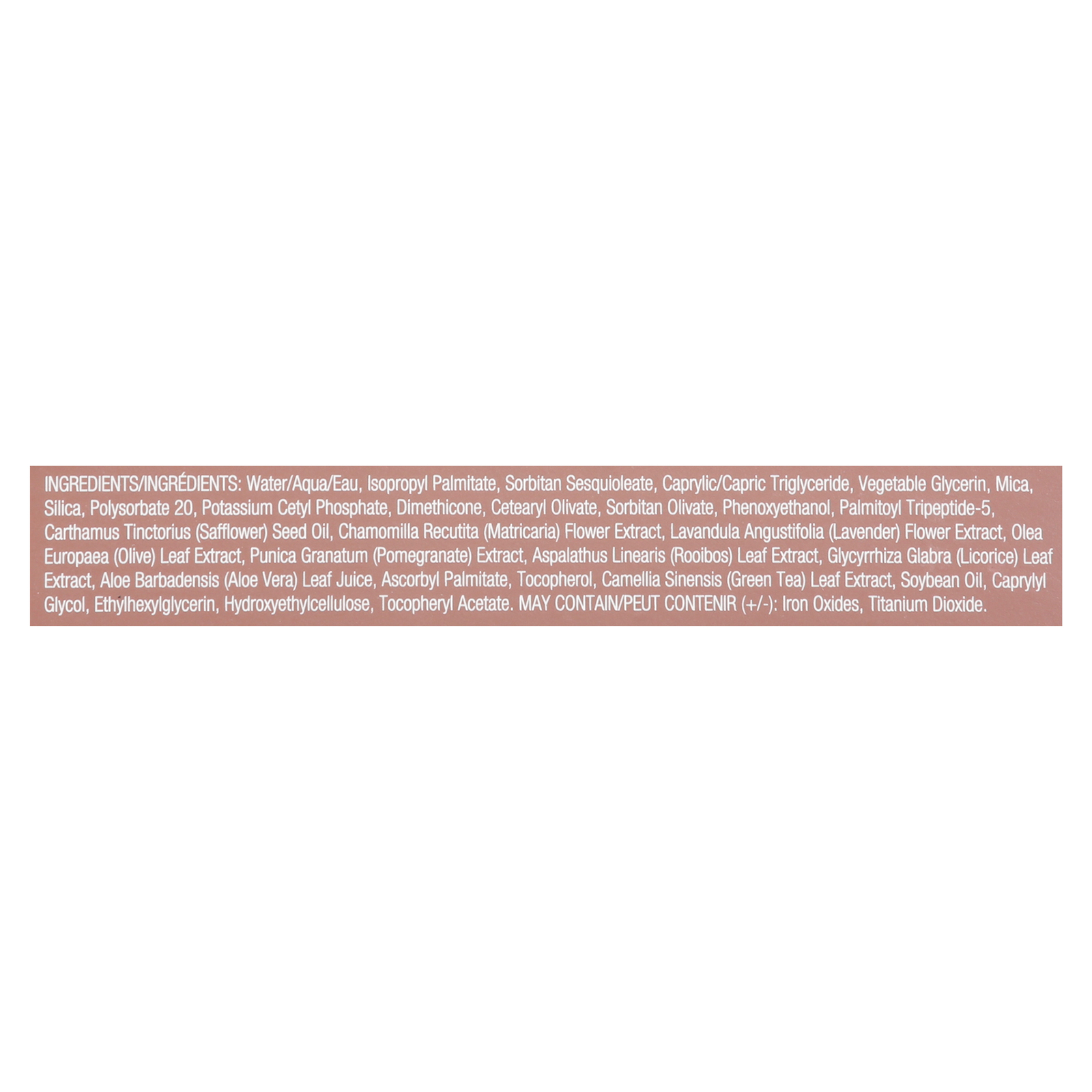 ingredients : water/aqua/eau;isopropyl palmitate;sorbitan sesquioleate;caprylic/capric triglyceride;vegetable glycerin;mica;silica;polysorbate 20;potassium cetyl phosphate;dimethicone;cetearyl olivate;sorbitan olivate;phenoxyethanol;palmitoyl tripeptide-5;carthamus tinctorius (safflower) seed oil;chamomilla recutita (matricaria) flower extract;lavandula angustifolia (lavender) flower extract;olea europaea (olive) leaf extract;punica granatum (pomegranate) extract;aspalathus linearis (rooibos) leaf extract;gly