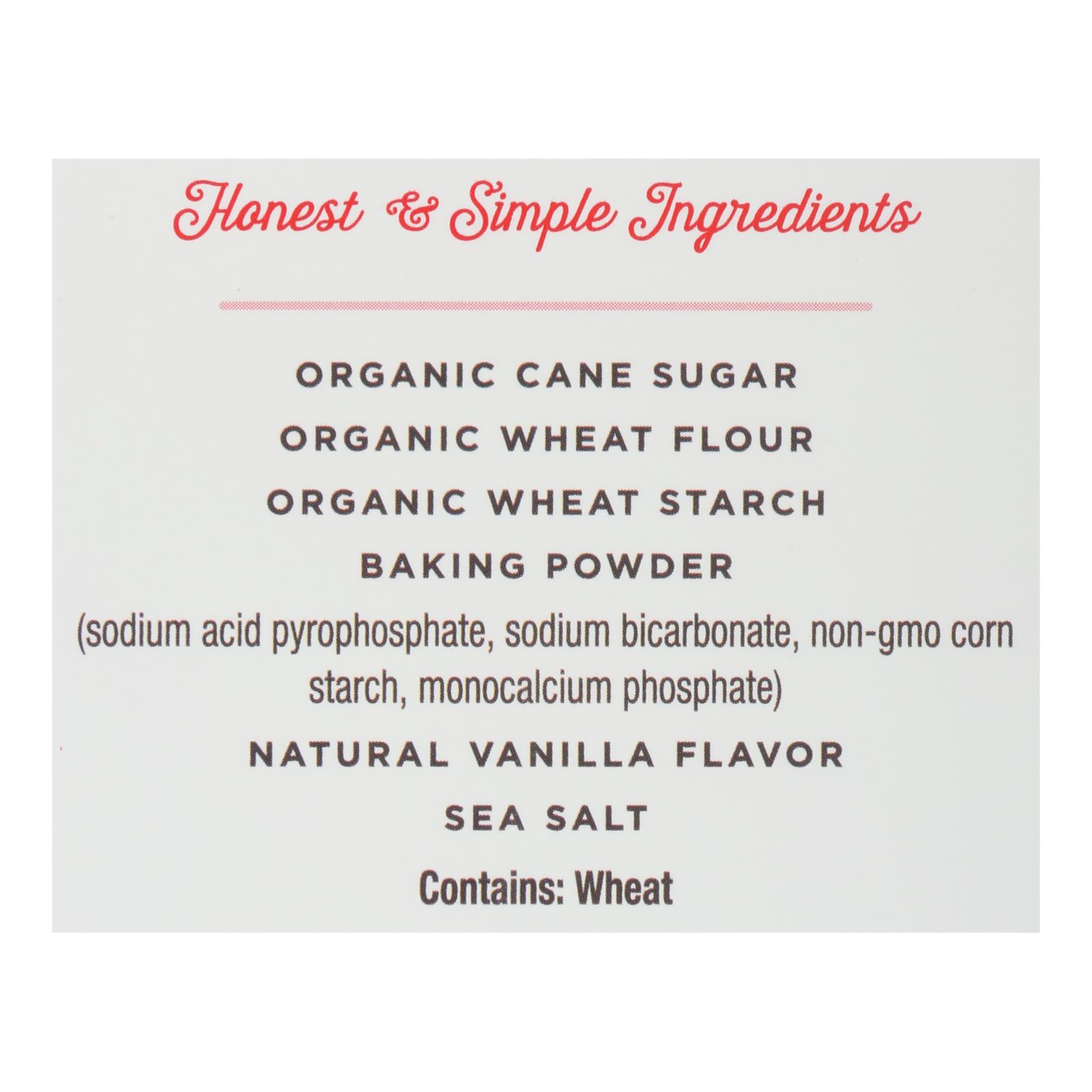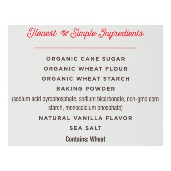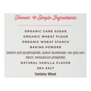 ingredients : organic cane sugar organic wheat flour organic tapioca starch baking powder (sodium acid pyrophosphate, sodium bicarbonate, non-gmo corn starch, monocalcium phosphate) natural vanilla flavor sea salt