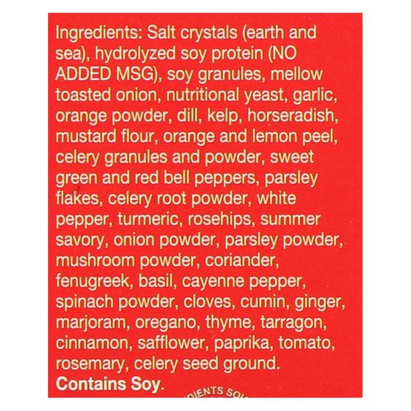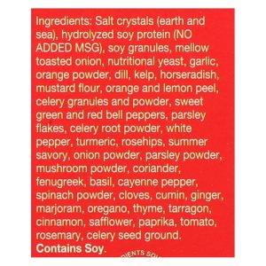 ingredients : salt crystals;earth and sea;hydrolyzed soy protein;no added msg;soy granules;mellow toasted onion;nutritional yeast;garlic;orange powder;dill;kelp;horseradish;mustard flour;orange and lemon peel;celery granules and powder;sweet green and red bell peppers;parsley flakes;celery root powder;white pepper;turmeric;rosehips;summer savory;onion powder;parsley powder;mushroom powder;coriander fenugreek;basil;cayenne pepper;spinach powder;cloves;cumin;ginger;marjoram;oregano;thyme;tarragon;cinnamon;saffl