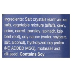 ingredients : salt crystals;earth and sea salt;vegetable mixture;alfalfa;celery;onion;carrot;parsley;spinach;kelp;beet root;soy sauce;water;soybeans;salt;alcohol;hydrolyzed soy protein;no added msg;molasses and dill seed