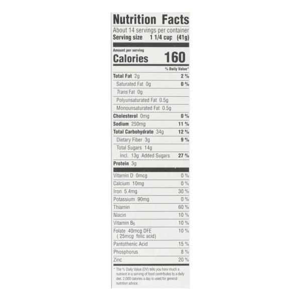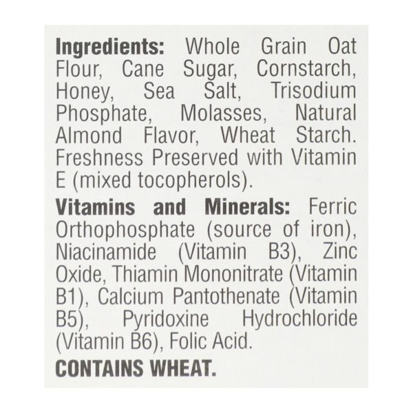 ingredients : ferric orthophosphate (source of iron);niacinamide (vitamin b3);zinc oxide;thiamin mononitrate (vitamin b1);calcium pantothenate (vitamin b5);pyridoxine hydrochloride (vitamin b6);folic acid;whole grain oat flour;cane sugar;cornstarch;honey;sea salt;trisodium phosphate;molasses;natural almond flavor;wheat starch;freshness preserved with vitamin e (mixed tocopherols)