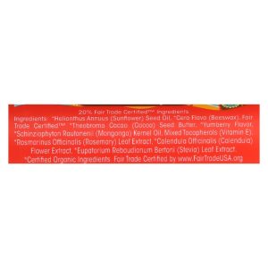 ingredients : helianthus annuus;sunflower;seed oil;cera flava;beeswax;fair trade certified™ *theobroma cacao;cocoa;seed butter;yumberry flavor;schinziophyton rautanenii;mongongo;kernel oil;mixed tocopherols;vitamin e;rosmarinus officinalis;rosemary;leaf extract;calendula officinalis;calendula;flower extract;eupatorium rebaudianum bertoni;stevia