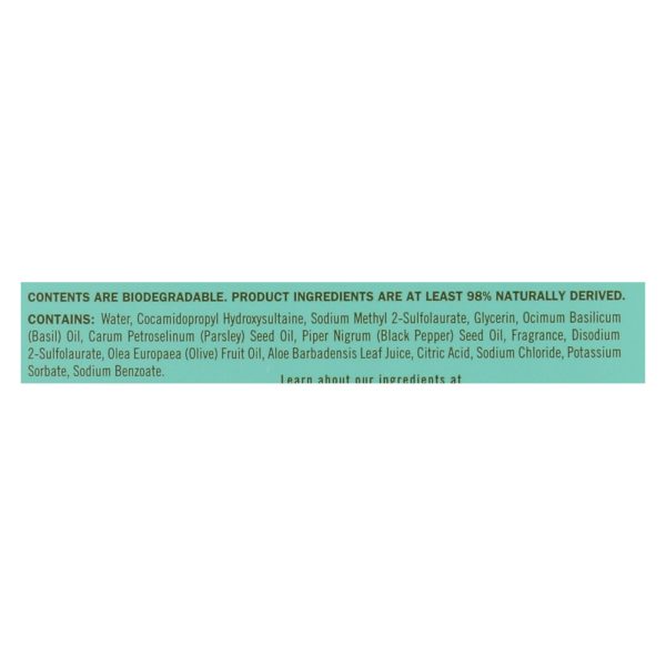 ingredients : contains: water;cocamidopropyl hydroxysultaine;sodium methyl 2-sulfolaurate;glycerin;ocimum basilicum;basil;oil;carum petroselinum;parsley;seed oil;piper nigrum;black pepper;seed oil. Fragrance;disodium 2-sulfolaurate;olea europaea;olive;fruit oil;aloe barbadensis leaf juice;citric acid;sodium chloride;potassium sorbate;sodium benzoate