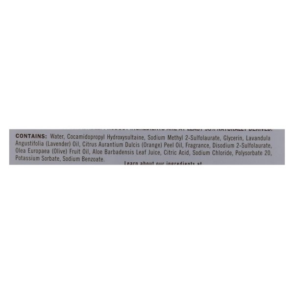 ingredients : water;cocamidopropyl hydroxysultaine;sodium methyl 2-sulfolaurate;glycerin;lavandula angustifolia;lavender;oil;citrus aurantium dulcis;orange;peel oil;fragrance;disodium 2-sulfolaurate;olea europaea;olive;fruit oil;aloe barbadensis leaf juice;citric acid;sodium chloride;polysorbate 20;potassium sorbate;sodium benzoate