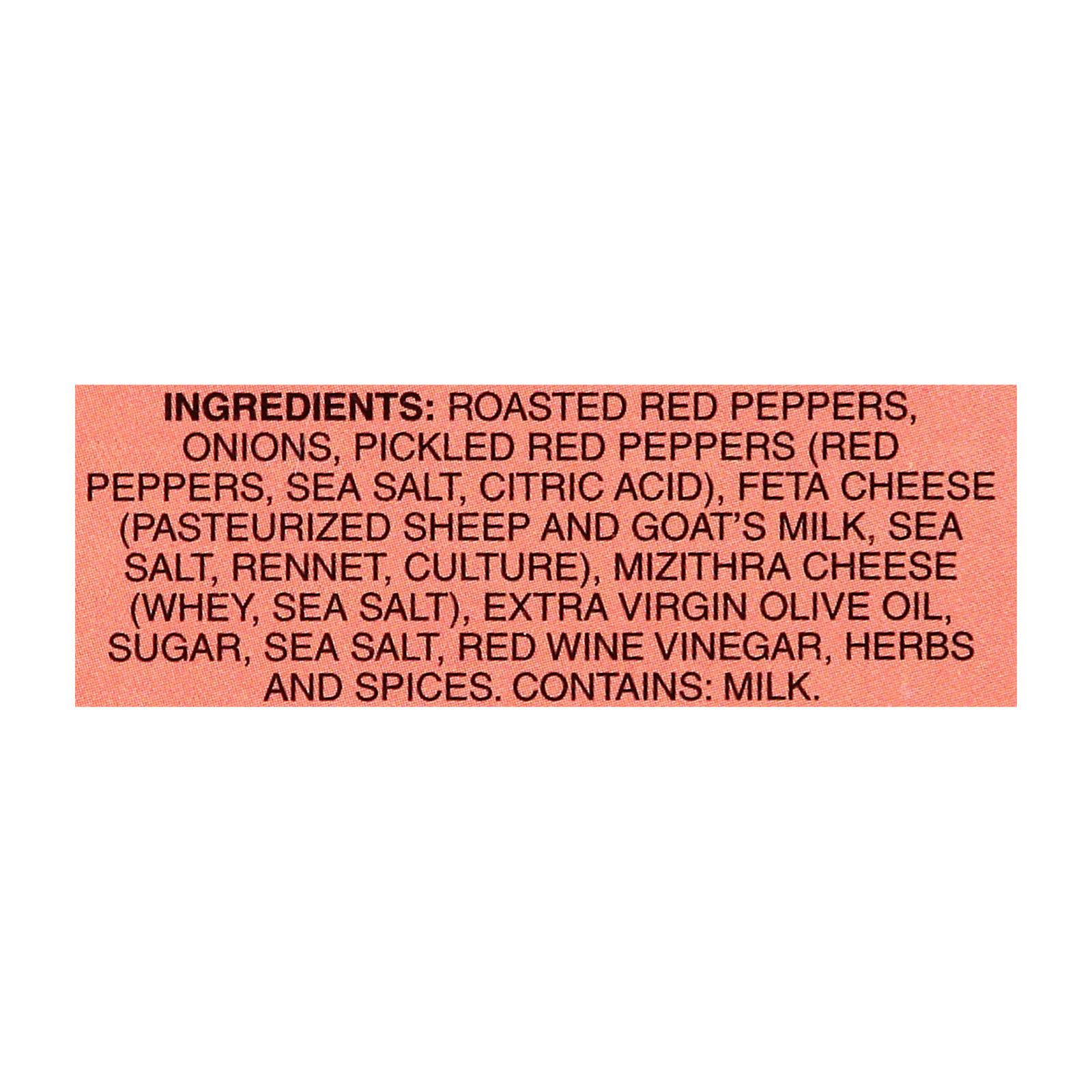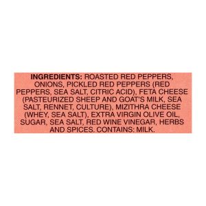 ingredients : roasted red peppers;onions;pickled red peppers (red peppers, sea salt, citric acid);feta cheese (pasteurized sheep and goat’s milk, sea salt, rennet, culture);mizithra cheese (milk whey, salt);extra virgin olive oil;sugar;sea salt;red wine vinegar;herbs and spices