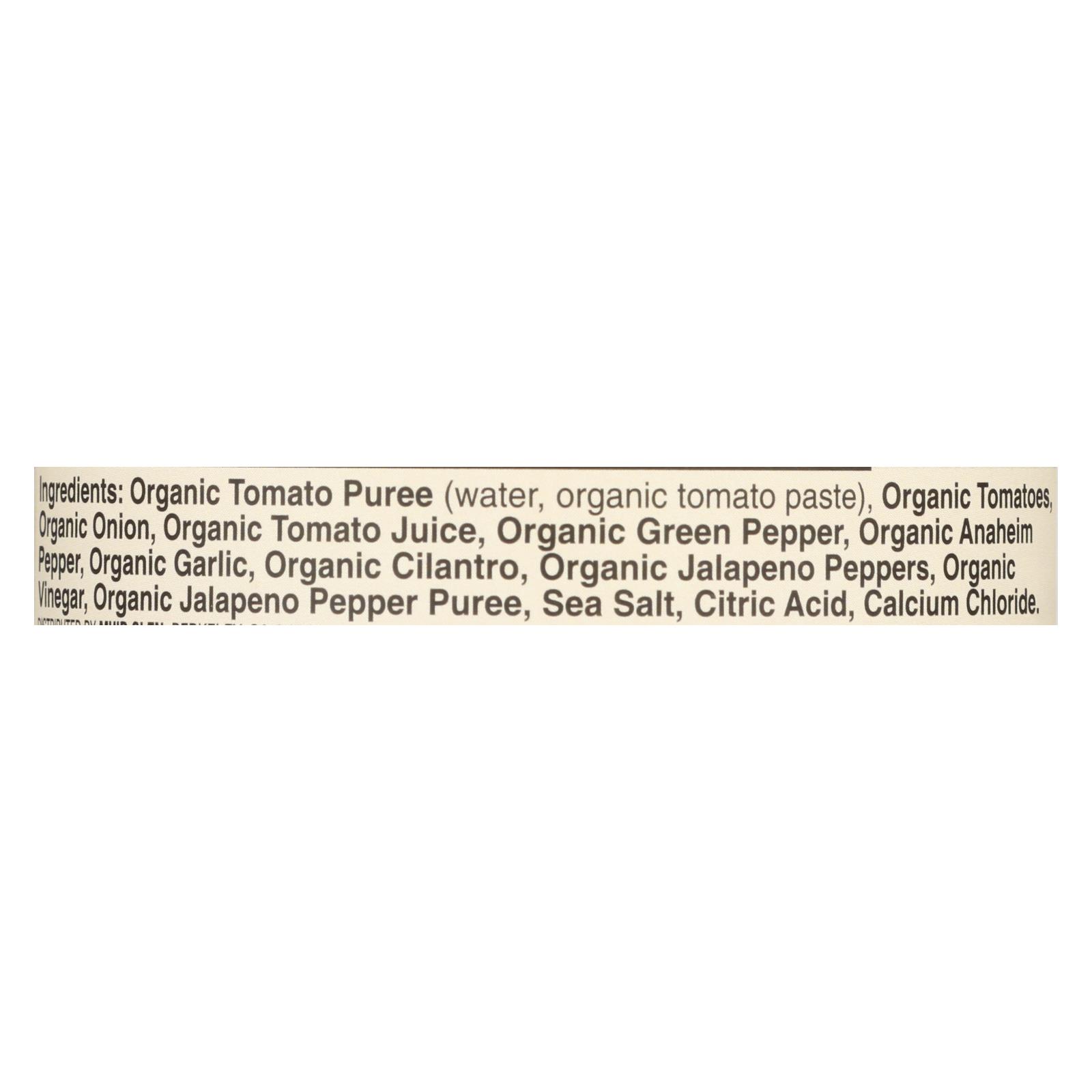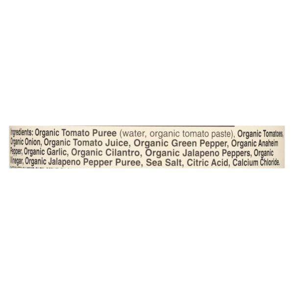 ingredients : organic tomato puree (water, organic tomato paste);organic tomatoes;organic onion;organic tomato juice;organic green pepper;organic anaheim pepper;organic garlic;organic cilantro;organic jalapeno peppers;organic vinegar;organic jalapeno pepper puree;sea salt;citric acid;calcium chloride