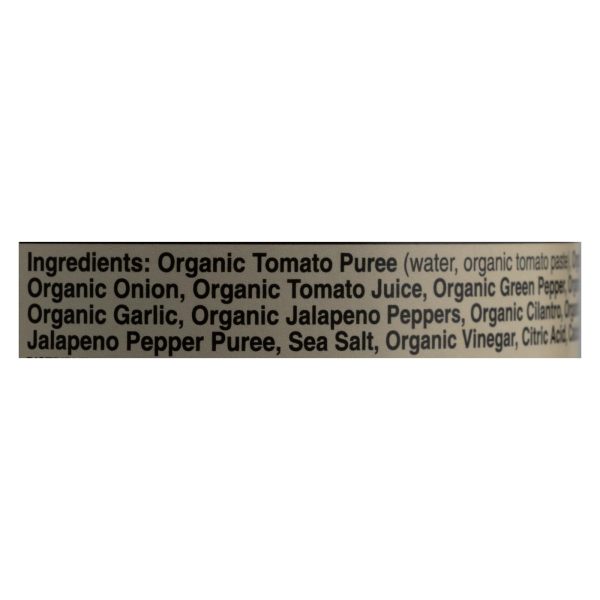 ingredients : organic tomato puree;water;organic tomato paste;organic tomatoes;organic onion;organic tomato juice;organic green pepper;organic anaheim pepper;organic garlic;organic jalapeno peppers;organic cilantro;organic lime juice;organic jalapeno pepper puree;sea salt;organic vinegar;citric acid;calcium chloride