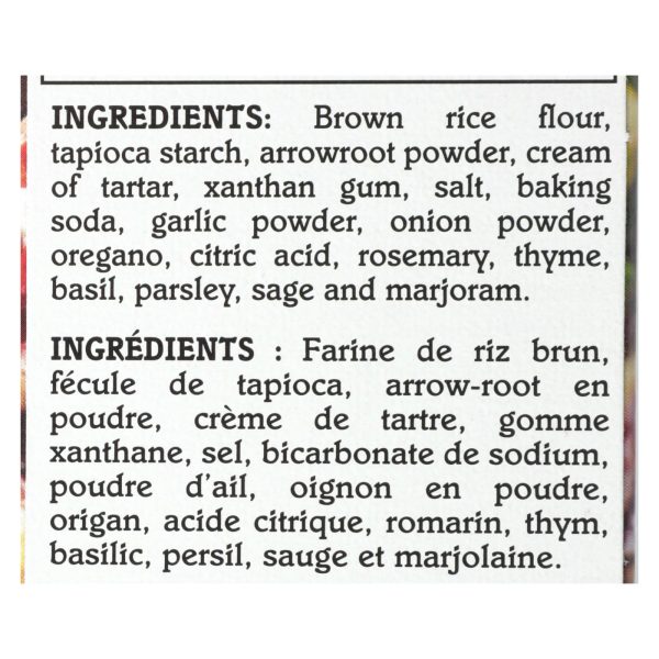 ingredients : brown rice flour;tapioca starch;arrowroot powder;cream of tartar;xanthan gum;salt;baking soda;garlic powder;onion powder;oregano;citric acid;rosemary;thyme;basil;parsley;sage and marjoram
