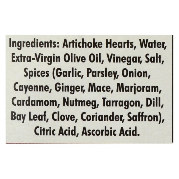 ingredients : artichoke hearts;water;extra-virgin olive oil;vinegar;salt;spices;garlic;parsley;onion;cayenne;ginger;mace;marjoram;cardamom;nutmeg;tarragon;dill;bay leaf;clove;coriander;saffron;citric acid;ascorbic acid