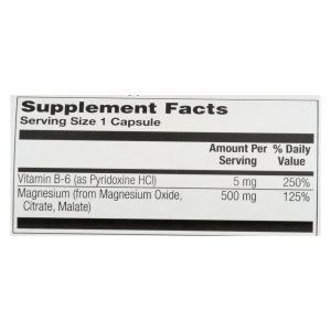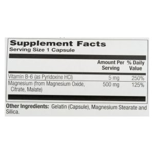 Nature’s life magnesium plus vitamin b6 dietary supplement helps you hit your daily micronutrient quotas. Each capsule in our 100 count bottle delivers 500 mg. Of magnesium oxide and 5 mg. Of vitamin b6 as pyroxidine hydrochloride. Magnesium plays a part in the health of your nerves and muscles as well as the optimal absorption and metabolism of other minerals. Take one capsule daily with food for best results.