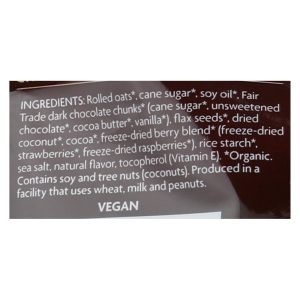 ingredients : rolled oats;cane sugar;soy oil;fair trade dark chocolate chunks;unsweetened chocolate;cocoa butter;vanilla;flax seeds;dried coconut;cocoa;freeze-dried berry blend;freeze-dried strawberries;freeze-dried raspberries;rice starch;sea salt;natural flavor;tocopherol;vitamin e