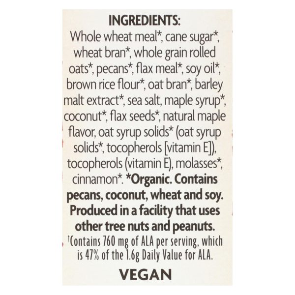 ingredients : whole wheat meal;cane sugar;wheat bran;whole grain rolled oats;pecans;flax meal;soy oil;brown rice flour;oat bran;barley malt extract;sea salt;maple syrup;coconut;flax seeds;natural maple flavor;oat syrup solids;tocopherols [vitamin e];tocopherols;vitamin e;molasses;cinnamon