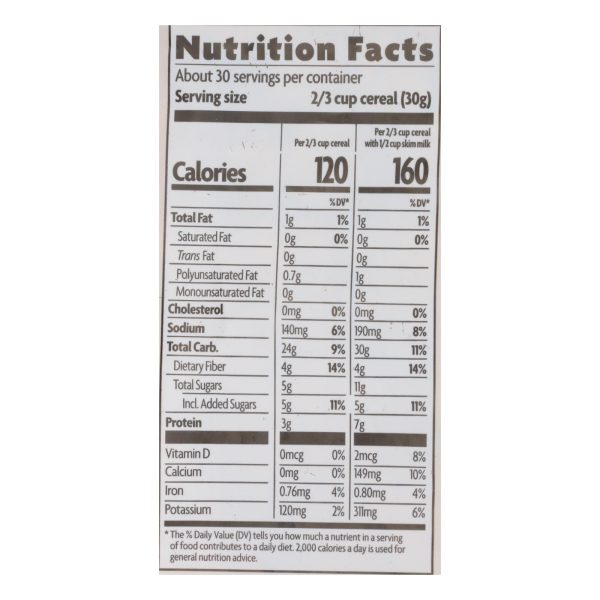 Nature’s path cereal, flax plus cinnamon contains whole wheat flour, wheat bran, oat bran and flax. This cereal is an excellent source of omega-3 fatty acids. It provides 11 g. Of whole grains, 4 g. Of fiber and 3 g. Of protein in every serving. We create our cereal using kosher ingredients that are non-gmo project verified and vegan-friendly and we use usda organic certified grains. The product includes one 32 oz. Bag. See nutrition facts panel for allergens.