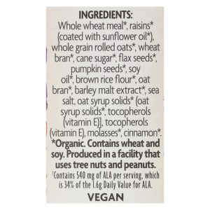 ingredients : whole wheat meal;raisins;coated with sunflower oil;whole grain rolled oats;wheat bran;cane sugar;flax seeds;pumpkin seeds;soy oil;brown rice flour;oat bran;barley malt extract;sea salt;oat syrup solids;tocopherols;vitamin e;];molasses;cinnamon