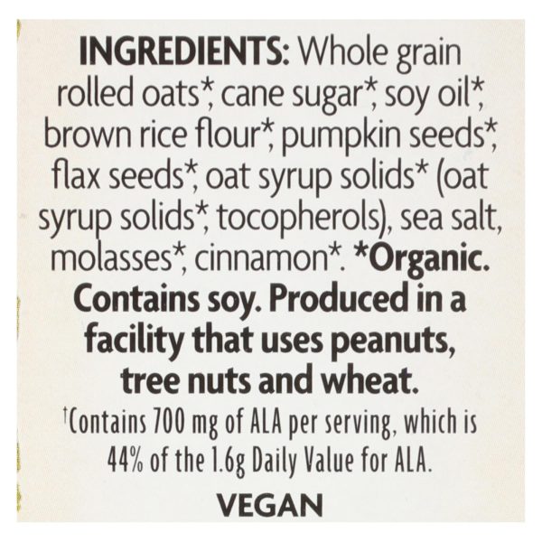 ingredients : whole grain rolled oats;cane sugar;soy oil;brown rice flour;pumpkin seeds;flax seed;oat syrup solids;oat syrup solid;tocopherols;sea salt;molasses;cinnamon