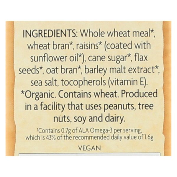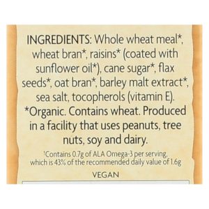 ingredients : whole wheat meal;wheat bran;raisins;coated with sunflower oil;cane sugar;flax seeds;oat bran;barley malt extract;sea salt;tocopherols;vitamin e