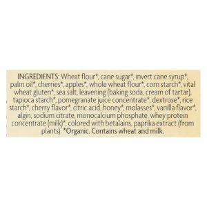 ingredients : wheat flour;cane sugar;invert cane syrup;palm oil;cherries;apples;whole wheat flour;corn starch;vital wheat gluten;sea salt;leavening;baking soda;cream of tartar;tapioca starch;pomegranate juice concentrate;dextrose;rice starch;cherry flavor;citric acid;honey;molasses;vanilla flavor;algin;sodium citrate;monocalcium phosphate;whey protein concentrate;milk;colored with betalains;paprika extract;from plants