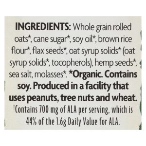 ingredients : whole grain rolled oats;cane sugar;soy oil;brown rice flour;flax seeds;oat syrup solids;tocopherols;hemp seeds;sea salt;molasses