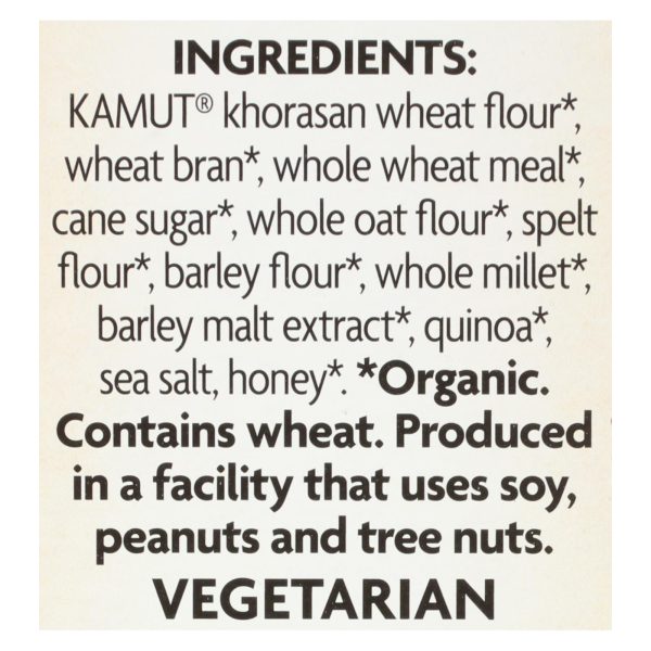 ingredients : kamut® khorasan wheat flour;wheat bran;whole wheat meal;cane sugar;whole oat flour;spelt flour;barley flour;whole millet;barley malt extract;quinoa;sea salt;honey