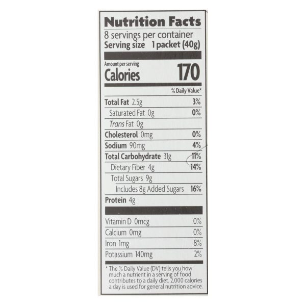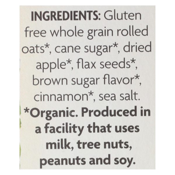 Nature’s path gluten-free hot spiced apple oatmeal is made with all non-gmo project verified and certified usda organic ingredients including rolled oats, dried apple and flax seeds. One box of nature’s path contains eight packets of gluten-free, vegan oatmeal and is low in fat, with only 20 calories from fat per serving. Nature’s path oatmeal is an excellent source of fiber, with 16% of your daily value of fiber per serving, for a breakfast that provides long lasting energy.