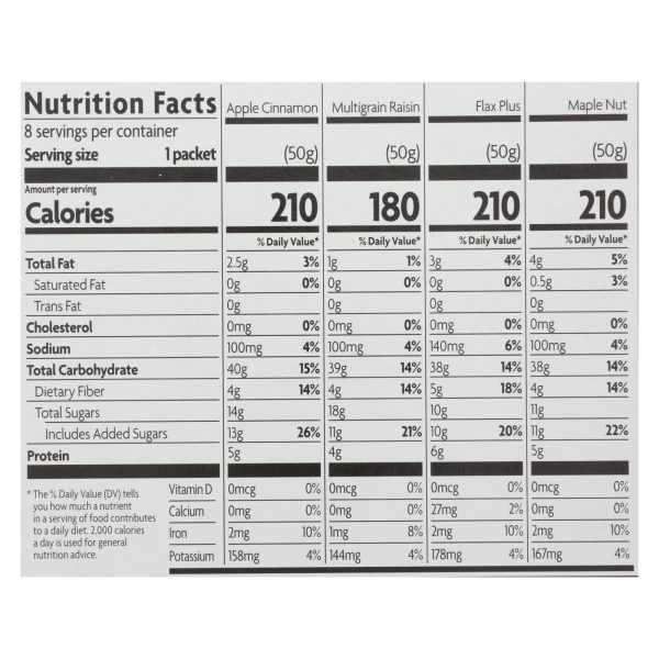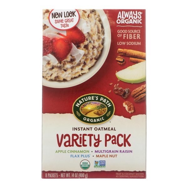 Nature’s path hot oatmeal variety pack of 8 is made with organic ingredients and is high in fiber. This variety pack provides a box of 2 packets each of apple cinnamon, multigrain raisin, flax plus and maple nut, containing whole grains, protein and fiber. Our hot oatmeal is made with kosher ingredients that are gmo-free and vegan. We use usda organic certified grains. See nutrition facts panel for allergens.