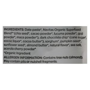 ingredients : date paste;dark chocolate chip* (cane sugar*, cocoa liquor*, cocoa butter*);sorghum;chia seed;cacao powder;pumpkin seed;sunflower seed;almond butter;lucuma powder;natural flavor;goji powder;maca powder;sea salt;acerola cherry powder