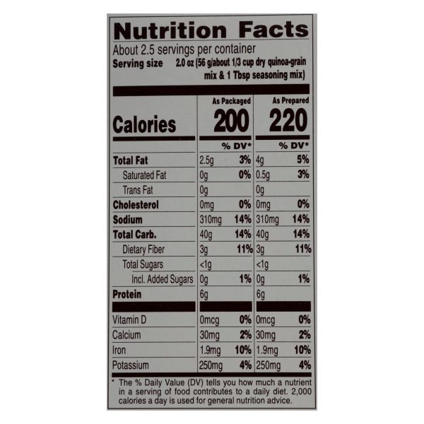 Flavor with other natural flavors. Per serving: 200 calories; 0 g sat fat (0% dv); 310 mg sodium (14% dv); less than 1 g total sugars. Non gmo project verified. Nongmoproject.org. At near east, we’re inspired by how well the world eats. Our journey began 50 years ago with a single, homemade armenian rice pilaf recipe. Today, the brand has expanded to a family of hearty grains, blended with vibrant spices and herbs from across the globe. Our simple yet flavorful dishes provide creative inspiration for any meal. See side panel for additional product information. Package contains empty space to accommodate grain to seasoning ratio. This package is sold by weight, not by volume. Contents may settle during shipping and handling. Neareast.com. Smartlabel: scan for more food information or call 1-800-822-7423. We’re here to help. Neareast.com or 800.822.7423. Please have package available when calling. Fair trade certified ingredient quinoa: fair trade certified by fair trade usa. At least 40% of fair trade certified ingredients.
